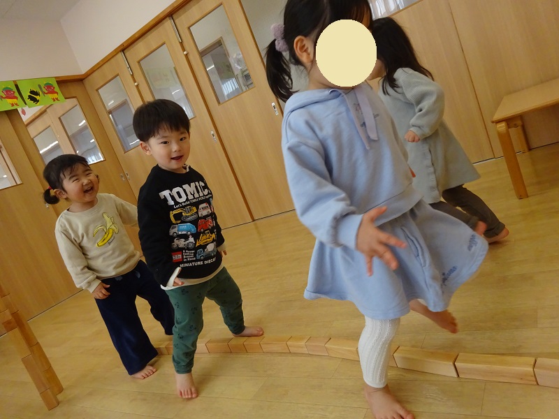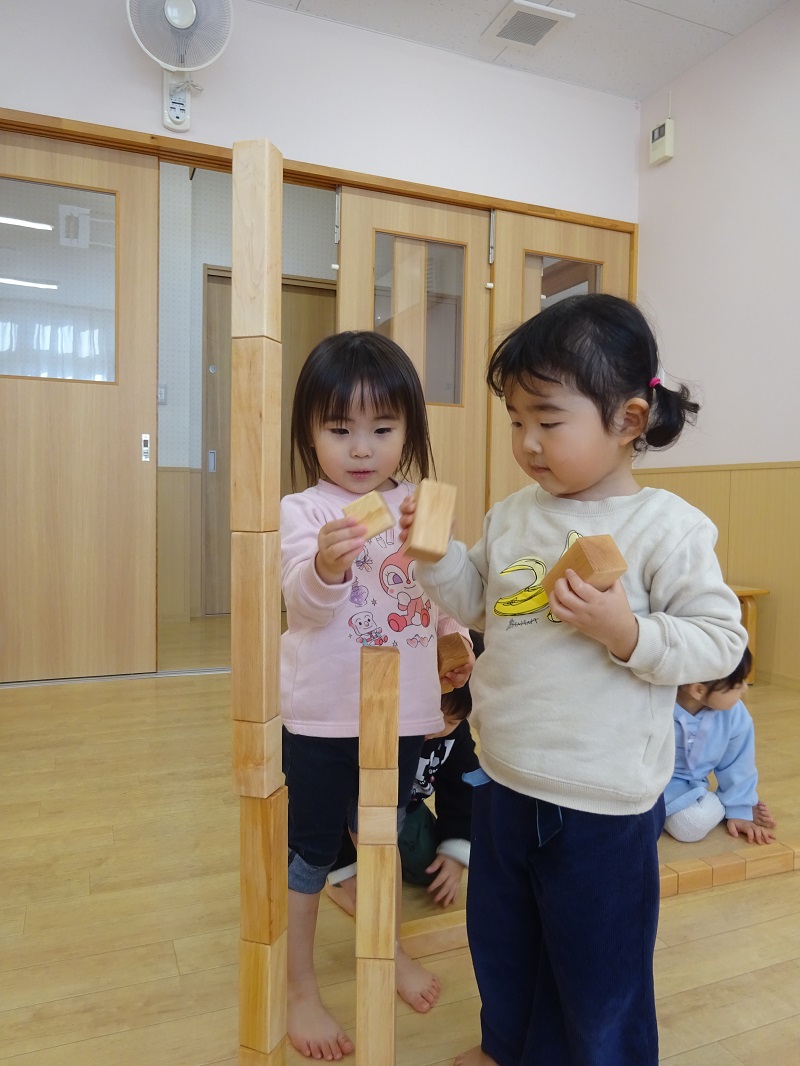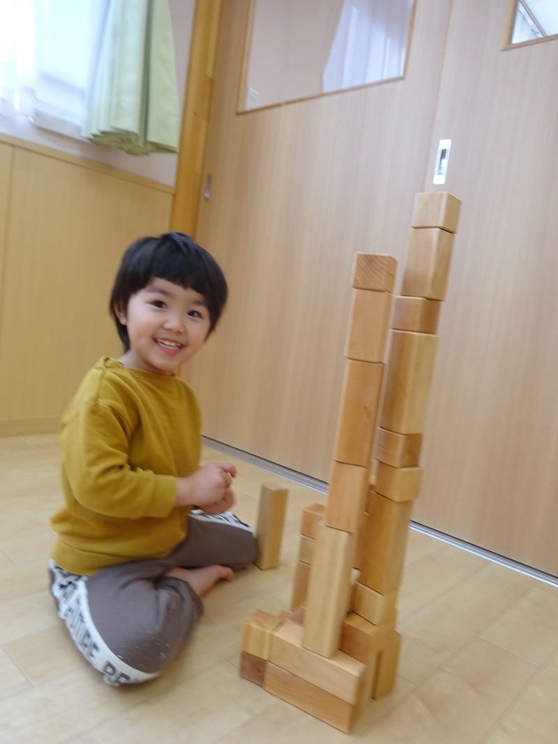 小坂園日記2024.02.06 たかーい😮 真剣に積み上げていくもみじ組🙂 積み木一つでさまざまな遊び方に発展させ、 大きな笑い声が響いていました😆♩ 大好きな友だちと手を繋いで参加した英語教室💖 今日も楽しい時間を過ごしました!
