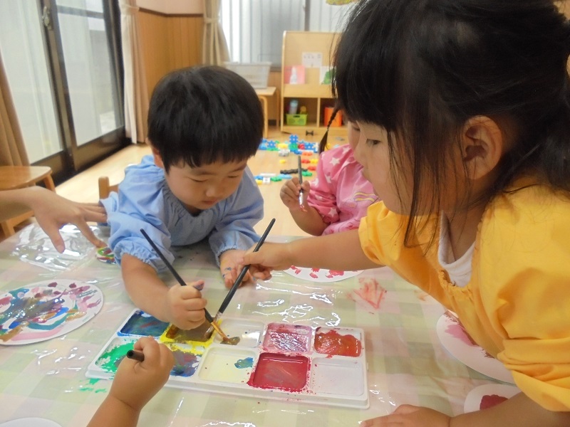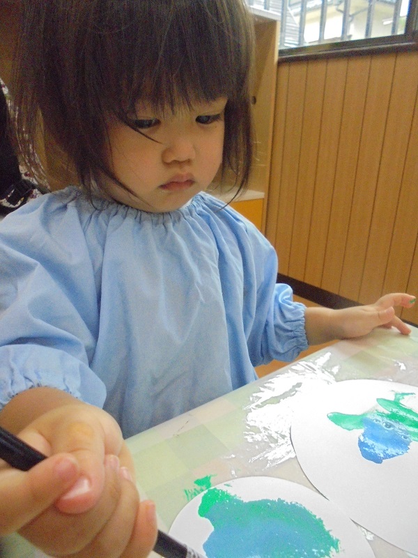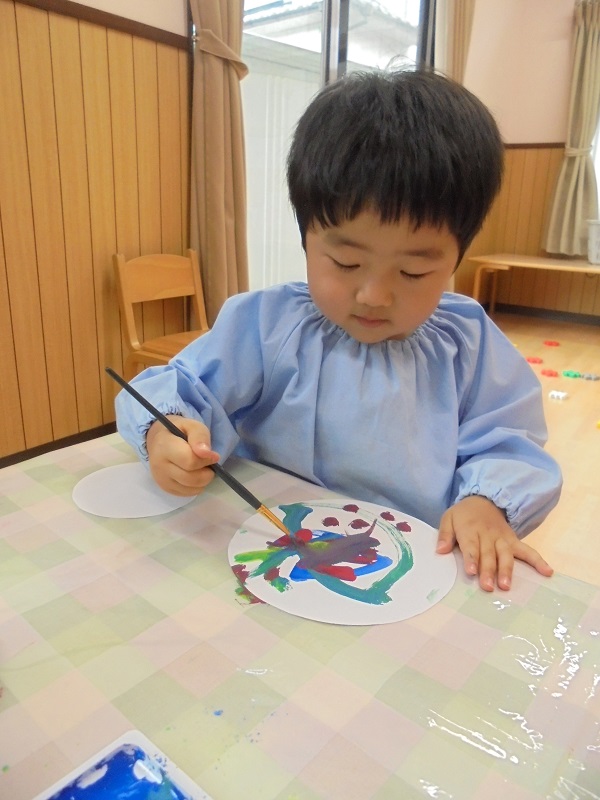 筆を使って絵の具に挑戦をしたもみじ組🍁