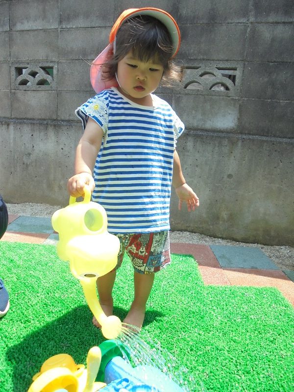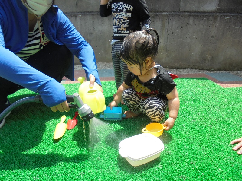 溝辺園日記2020.06.13 冷たくて気持ちいい💦(溝辺園) 毎日暑い日が続くので、水をつかって遊びをしました!! とっても気持ち良さそうです✨ いろいろな入れ物に水を入れて楽しそうです💛 水をジャ~💦 離れたところではすもも組の友だちがホースを持ってお手伝い♪