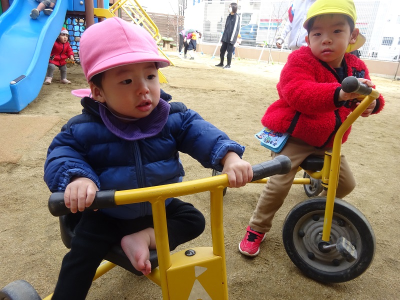 小坂園日記2024.02.08 園庭で🌞 久しぶりに園庭で遊びました✨ 滑り台に座って「おーい!」手を振ってくれました🎵 頑張って難しい遊具にも挑戦しました😊 大きい三輪車にも乗って満足😊 鉄棒も上手にできました✨ またたくさん遊ぼうね!
