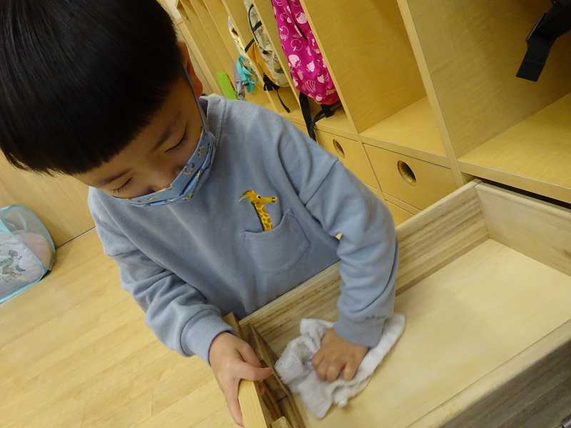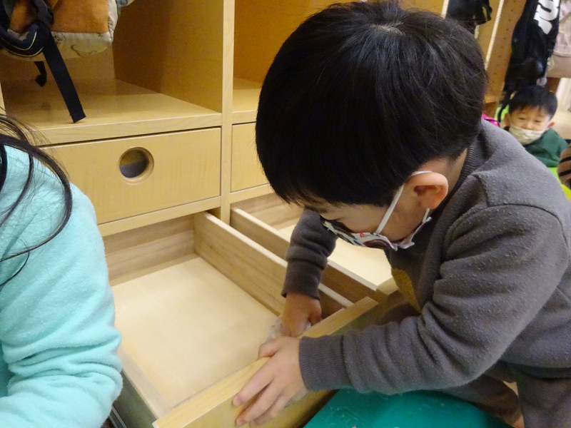 小坂園日記2022.12.27 大掃除✋ サンタさんにもらったプレゼントで 元気いっぱい遊んでいます💖 嬉しくてワクワクが止まらず大喜びです♪ 年末なので、自分のロッカーを 自分で掃除して整えます✨ 明日は今年最後の登園日です✨ 元気な姿を待っています🎵