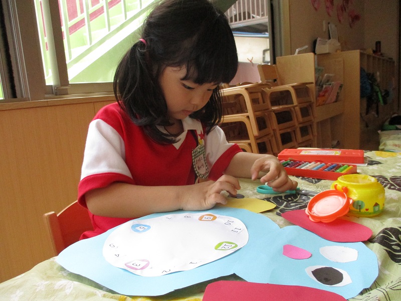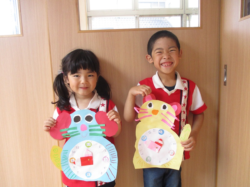 小坂園日記2019.05.30 時計を作りましょ。 小坂園 犬の形に切ります。チョキチョキ 顔をはって ぺたぺた 動物の時計ができました。 犬の名前は「りんちゃん」 猫の名前は「あゆちゃん」 かわいいでしょ。 「時計ができました。」