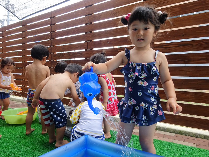 今日の給食2020.07.02 水遊び始まりました~♬ (小坂園) 「水遊びまだ~?」と ビーチバックを持って登園するもみじ組です⭐ かわいい&かっこいい水着に着替えして楽しみました💗 「気持ちいい♬」と大満足です😊💗 これから毎日楽しもうね👙🚿💦