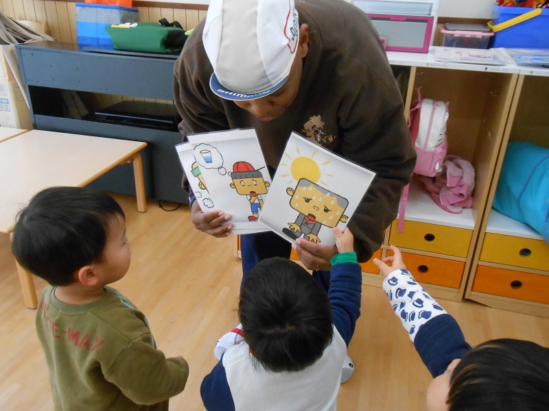 溝辺園日記2018.01.06 英語教室!溝辺園 英語教室の日でした✨ ケビン先生が来ると「やったー★!」と 嬉しそうな子どもたちです(*^▽^*) 今の気分は??? 「happyハッピー?」「hotホット?」「sleepyスリーピー?」 などカードから選んでいきます☆彡 楽しい時間はあっという間! 最後は抱っこして写真を撮ってもらいました💛💛 また、会おうね!