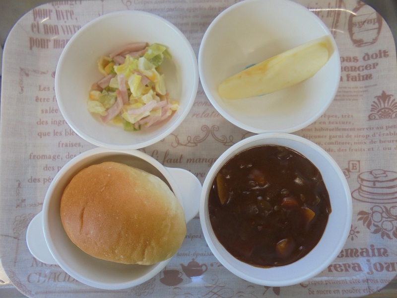 ロールパン ビーフシチュー キャベツとコーンのサラダ りんご です
