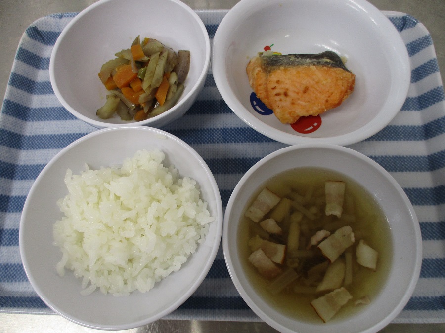 ごはん 鮭のムニエル ごぼうとこんにゃくの炒め煮 野菜スープ です