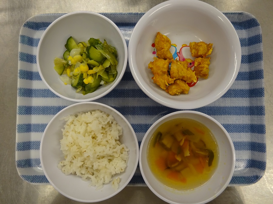 ごはん ささみのカレー揚げ レタスとコーンのサラダ コンソメスープ です