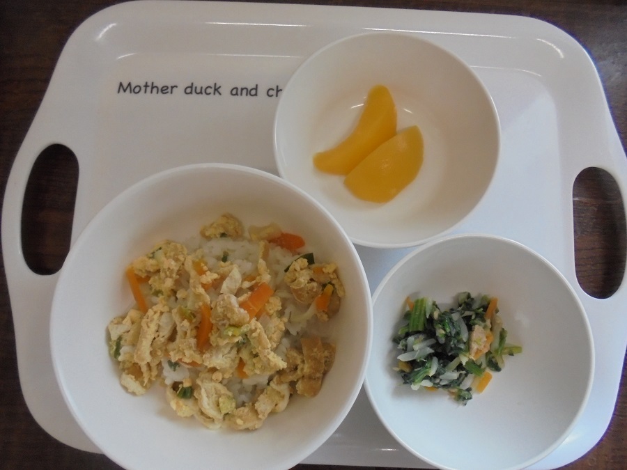 衣笠丼 ほうれん草とツナの酢和え 桃缶 です