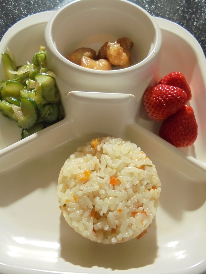 ピラフ 鶏肉のマーマレード煮 グリーンフレンチサラダ いちご です
