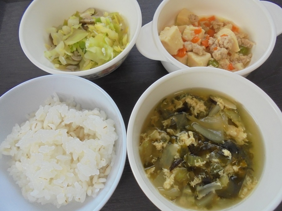 ごはん 高野豆腐のひき肉かけ おひたし 五目スープ です