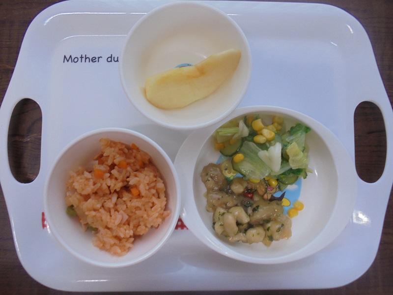 今日の給食2019.05.31 5月31日の給食☆ 今日の給食 ケチャップライス 鶏肉のオニオンガーリック レタスとコーンのサラダ りんご です 今日は ハッピーデーでした サラダの中に入る レタスをちぎったり にんじんやハムを楽しそうに型抜きをしていました
