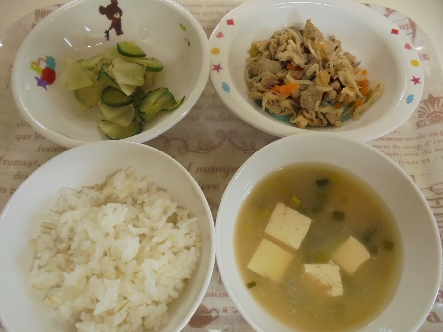ごはん 豚肉と切干大根の煮物 うりの胡麻和え じゃが芋の味噌汁 です