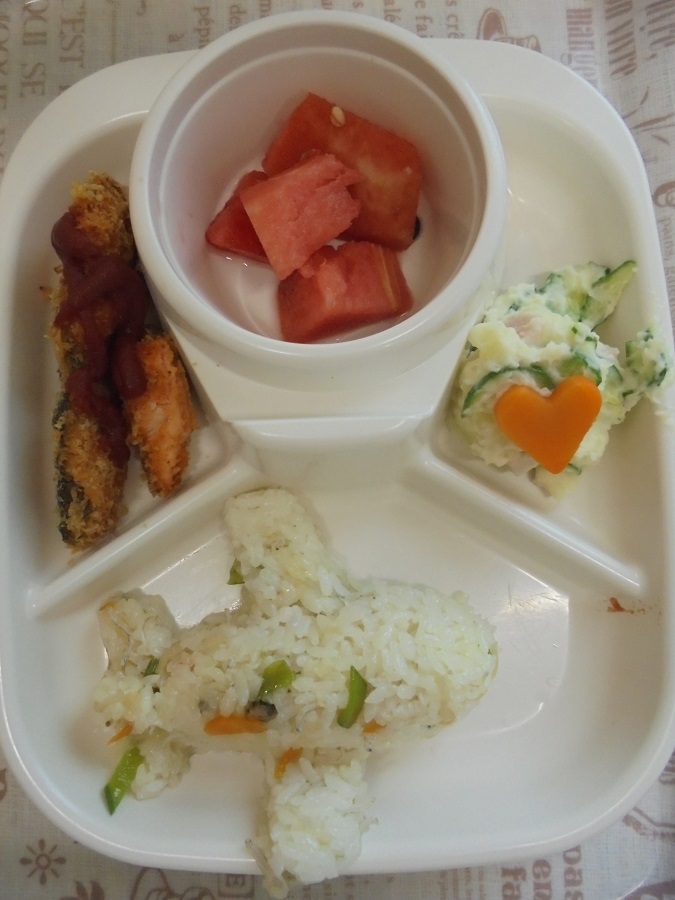 おもぶりごはん 鮭のフライ ポテトサラダ すいか です