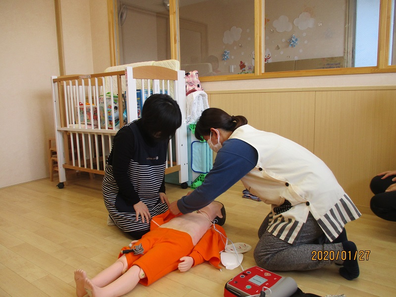 溝辺園日記2020.02.03 AED研修(溝辺園・小坂園) 園内でAED研修を行いました。 看護師の適切な指導の下、職員全員が練習用のAEDを使いました。 緊急事態にすぐ対応できるよう今後も気を引き締めていきます!