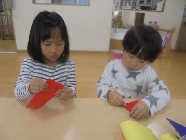 保育者の見本を見ながら真剣な表情でひとつひとつ丁寧に折っていきます(`・ω・´)