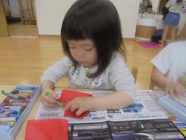 いちょう組さんもちゃんと折り紙を押さえながら描いています(*^-^*)