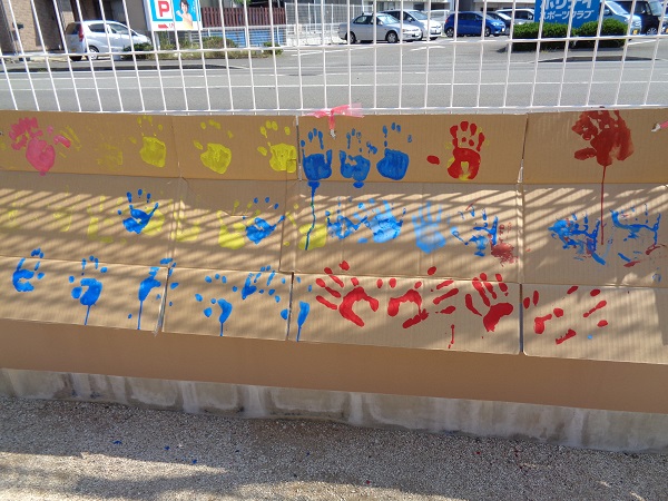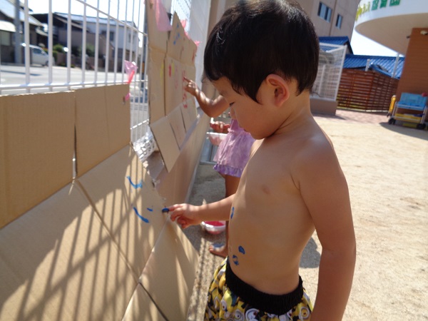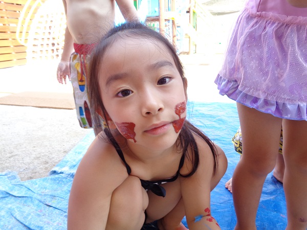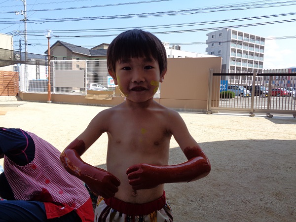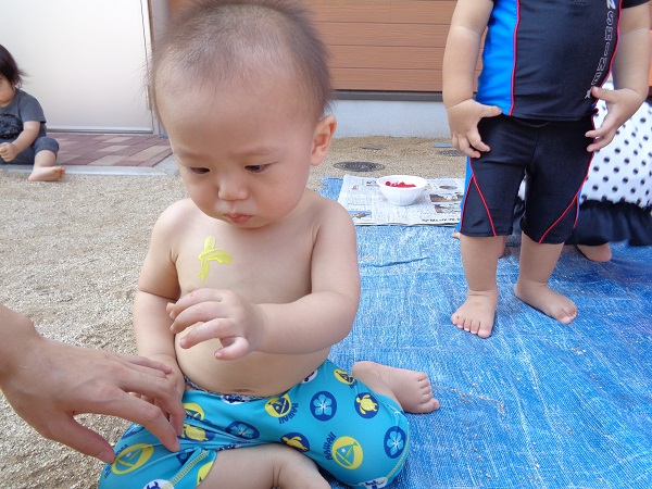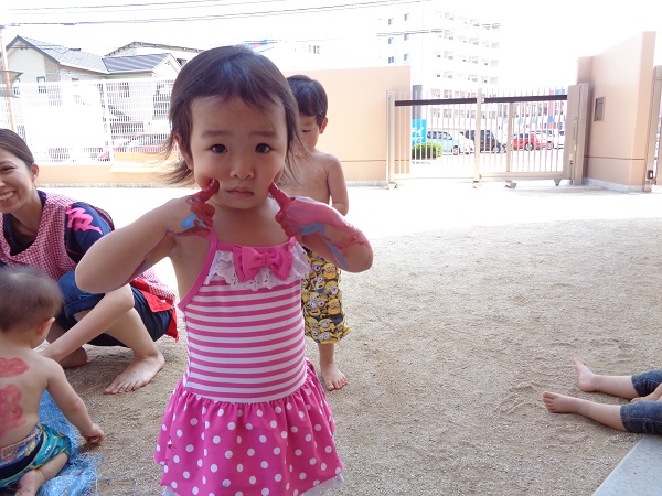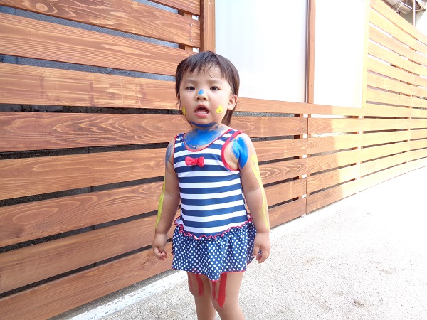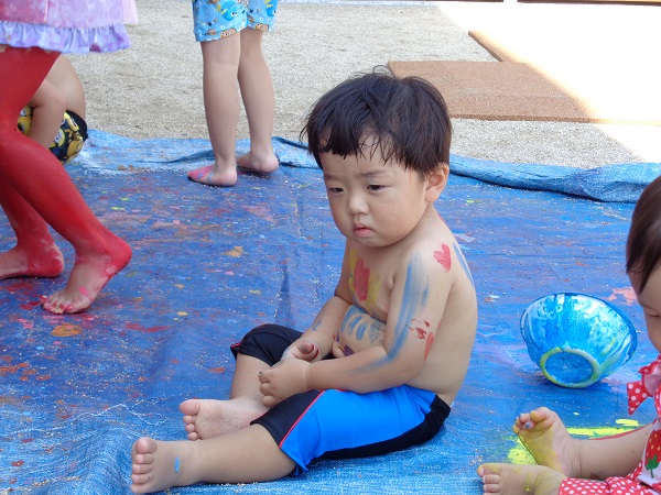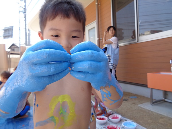 小坂園日記2018.08.29 いろ!いろ!いろ! 小坂園 今日は、まちにまったボディペインティングの日(#^.^#) すもも組さんはキョトン(*’ω’*) これ、なーに 顔につけて猫にへんしーん🐈(=^・・^=) 手につけたよ☆きもちいいよ☆ 僕はダンボールに絵を描こう! ヒーローに変身だー(#^^#) 私の顔かわいいでしょう!カワ(・∀・)イイ!! いろんなとこにつけたよ! 今、水色と格闘中! みんなで絵を描きました。☺ みんなの手、手、手💪 ボディペインティングって楽しいね! らくがきされちゃった(*’ω’*) みんなでポーズ!