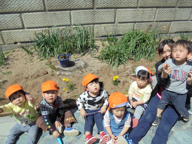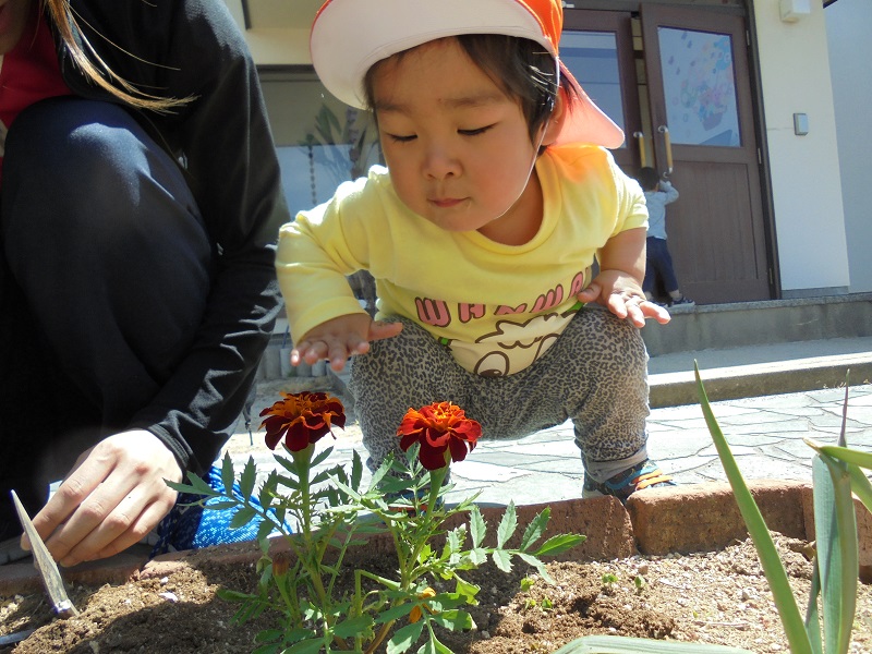 溝辺園日記2018.04.26 お花を植えたよ!溝辺園 園庭を彩るお花植えに もみじ組のみんなで挑戦しました♪♪ 「おおきくなぁれ✨」と たくさん声をかけながら植えました(^^) 土の中にはミミズさんもいましたよ! みんな興味深々ですが近くで見てみると 「こわーい💦」と顔がこわばっていました(*`艸´)ウ 最後はお花と一緒にパシャリ📷✨ これから水やりをしてお世話していきます! 登園の際は、園庭にも目を向けてみてくださいね♪