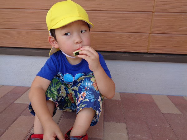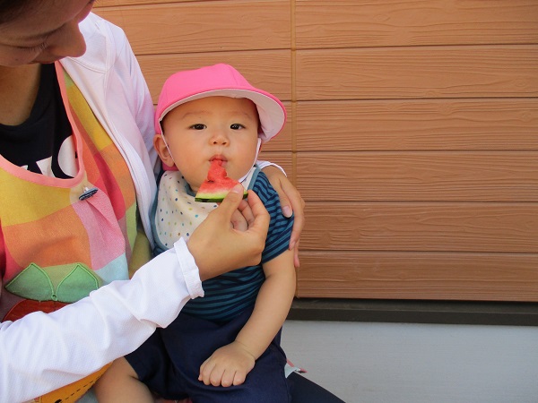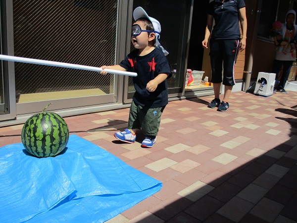 小坂園日記2018.08.15 すいか割りに挑戦!! 小坂園 今日はみんなですいか割りをしました! さくらんぼ組さんは目隠しが怖いのでなしで挑戦! おっ!構えが決まってます(*^▽^*) もみじ組さんは目隠しをして挑戦!気合十分です(^O^) 最後はやっぱり年長のふじ組さんに決めてもらいましょう! 4人で力を合わせてえいっ!! 協力してすいかを割ることができました!さすがです(≧▽≦) すももぐみさんもパクッ! いちょう組さんも(まだおかわりあるかなぁ~)なんて横目で見ながら 美味しそうに食べていました。 また来年もすいか割りしようね(*^-^*)