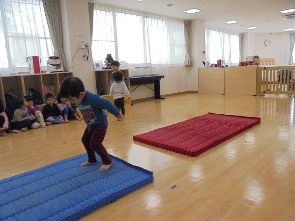 小坂園日記2018.03.09 とび箱に挑戦! 勝山園 体操教室の日 始めは、マット運動♪ マットの小川をぴょーんと飛び越えることが出来ました(^^♪ 次は、ブリッジです。お腹をぐーんと持ち上げて とっても上手です!( ^ω^ ) そして最後はとび箱に挑戦! 小さい組さんはよいしょっと全身を使ってとび箱を飛び越えようと 頑張っています! いつもより高い段に挑戦の大きい組さん!足が大きく開いていますね! どの子も怖がらずに挑戦する姿はいつもすごいなぁと思います(*´▽`*)