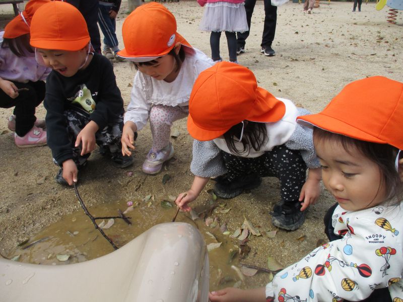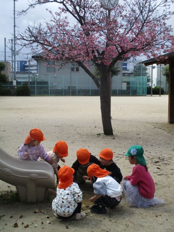 小坂園日記2026.03.30 もみじ組さんとけやき組さんでお散歩に行きました! もみじ組さんとけやき組さんでお散歩に行きました。 けやき組のお兄さん、お姉さんたち。 優しく手をひいて、一緒に歩いてくれています😊 公園についてみると、早咲きの桜が咲いていました🌸 水たまりに興味津々! カメラにポーズ✌ みてみて~🌸 一緒に遊べて、楽しかったね!