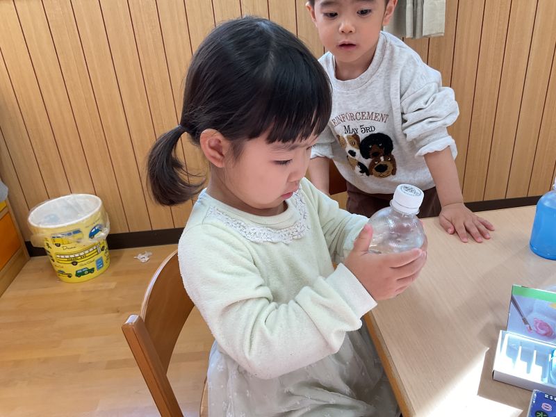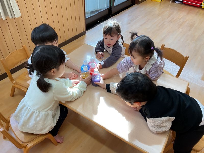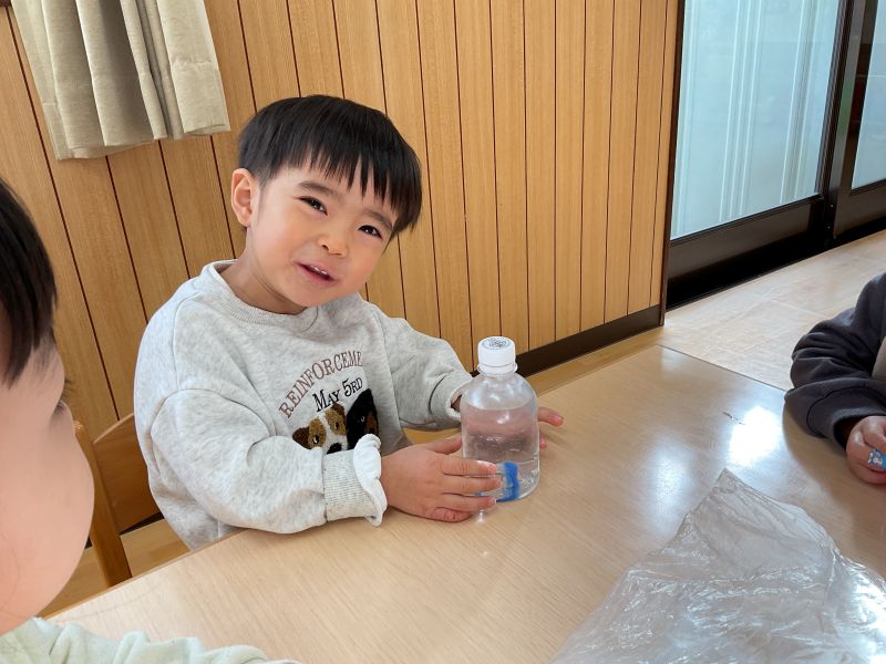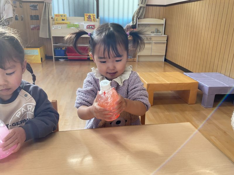 溝辺園日記2026.01.23 ジュースづくり🎵 もみじ組さんのハッピーデーは、ジュース作りをしました! 好きな色の絵の具を入れてシェイクシェイク🎵 初めは不思議そうな表情を浮かべていた子も、色の変化に気づき目を輝かせていたもみじぐみさん🎵 みんなで「かんぱーい!」 ごっこ遊びが大好きな子どもたちです😊