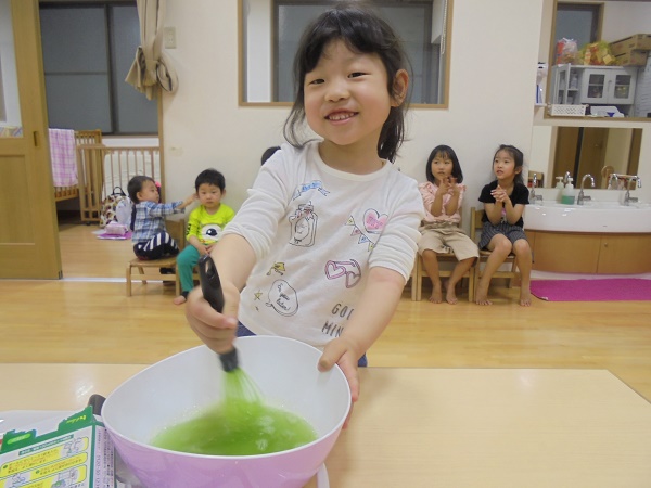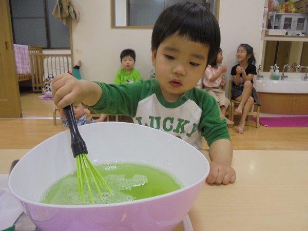 2歳児さんもちょっぴり緊張しながら頑張って混ぜることができました!