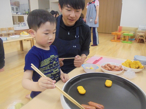 ペアになったお兄さん、お姉さんと一緒にたこさんウィンナーを
