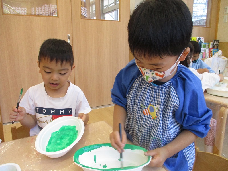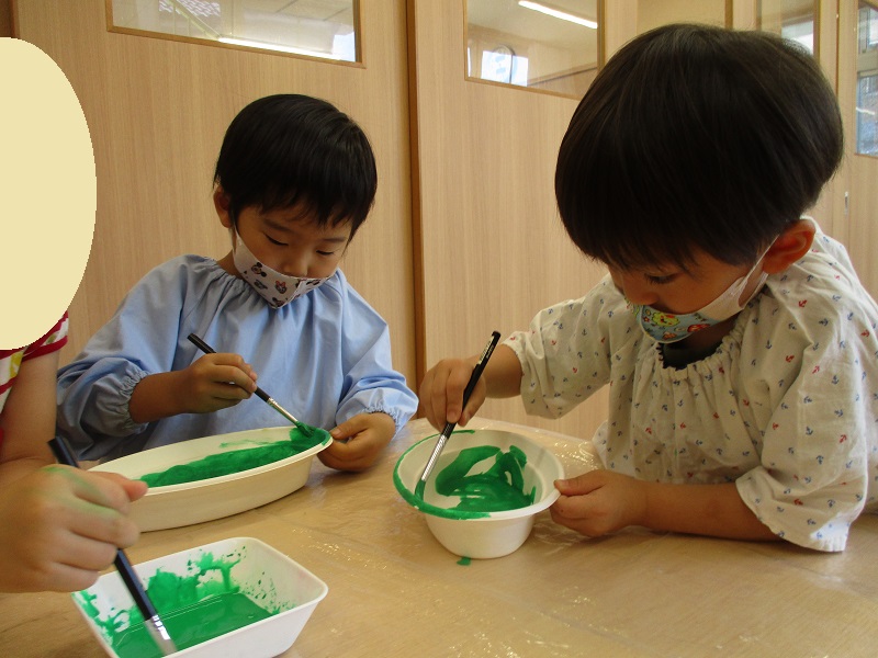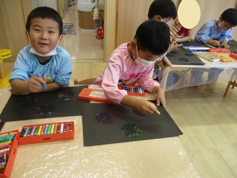 参観日に作った花火のまわりに星などを描いて完成させました。
