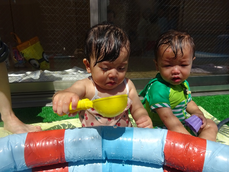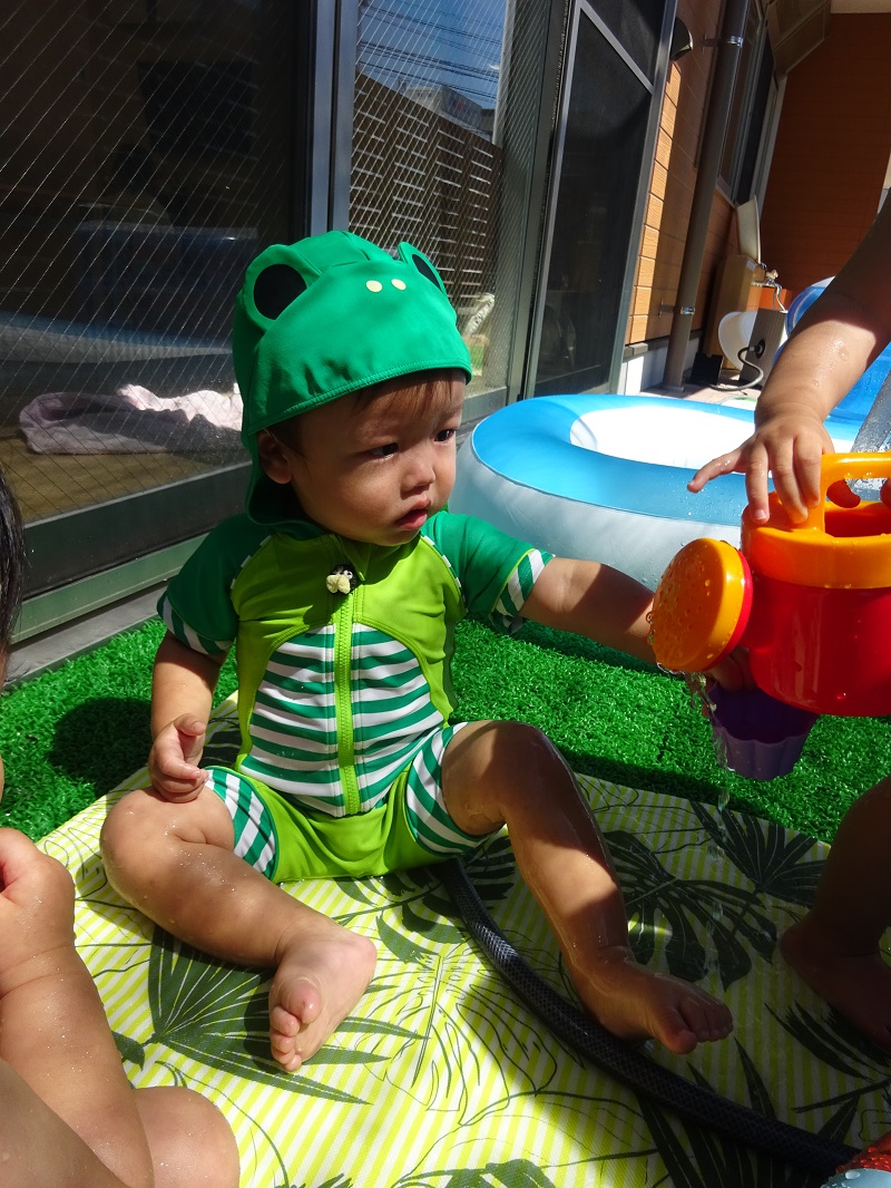 小坂園日記2022.07.01 プール開き プール開きです!みんなかわいい水着を着て水遊びをしました😀 少し不安そうな子や水が顔にかかっても平気な子など様々でしたが 楽しめたようでした😊 カメラ目線でいいお顔😉 毎日プール遊び楽しもうね✌