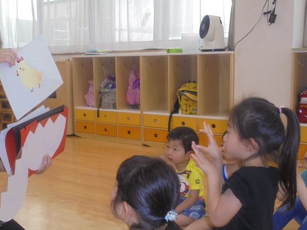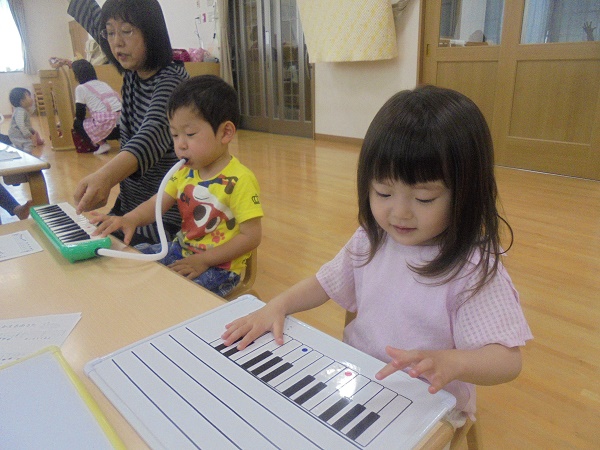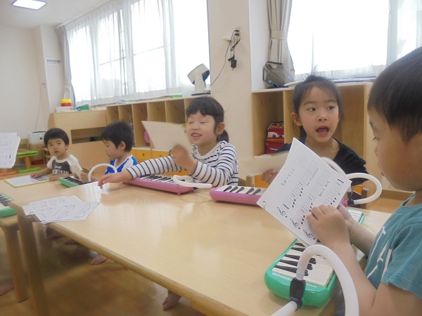 小坂園日記2018.05.28 リトミック教室♪ 勝山園 リトミック教室の日です♪ まず始めは、歌に合わせて卵の中から出てきた動物を真似っこです。 コケコッコーの表現が上手にできていました(*^-^*) 次は、椅子取りゲームならぬ綱取りゲーム! 音楽が止まったとたんどの子もさっと綱の輪っかの中へ 入ることができました(*^▽^*) 鍵盤ハーモニカの練習では新しい楽譜も加わって真剣に練習中! 初めてのいちょう組さんも頑張っていましたよ(*´▽`*) これから頑張って練習しようね!!