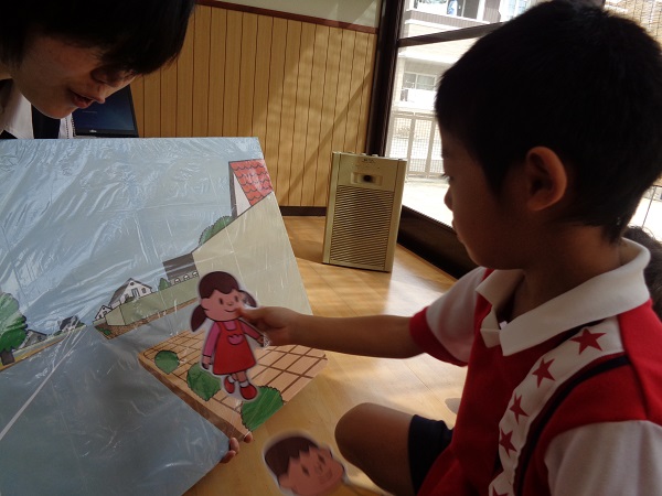 お姉さんと一緒に来たのは、かわいいお友達のだいちゃんです。だいちゃんと一緒に道路の渡り方を勉強しました。信号が青になってもすぐに渡るのではなくて「右見て、左見て、もう一度右を見ること」を教えてもらいみんな真剣です。そして、道路を歩くときは、白線のどちら側を歩くのかクイズ形式で教えてもらいました。