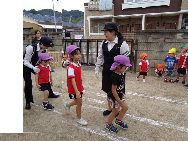 今日は、バスに乗ってグループ園である溝辺園に行きました。今まで何度か行事や園外保育でかかわっていますが今年度、初めて溝辺園にお邪魔しました。そして、松山東警察署の安全協会の指導員さんや市役所の方達から交通安全の大切さを教えてもらいました。