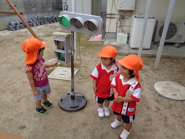園庭にできた道路や信号、横断歩道を利用して正しい歩き方や渡り方を指導員さんに丁寧に教えてもらいました。