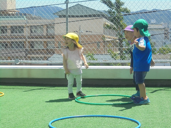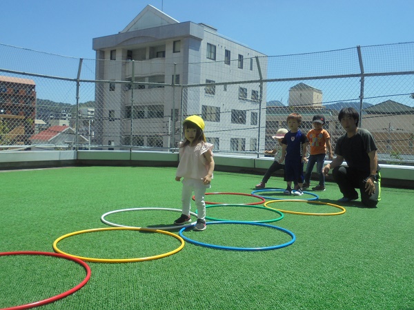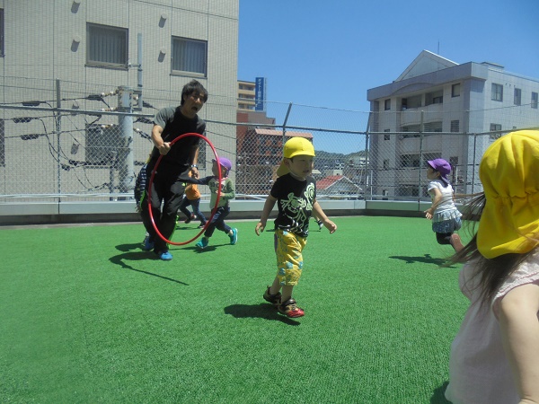 小坂園日記2018.05.28 体操教室♪ 勝山園 体操教室は、フープを使っていろいろな運動をしました。 まずは一列の輪をぴょんぴょん! みんなフープの真ん中を上手に跳べました(*^-^*) 次は、けんけんぱっ!いちょう組さんもちゃんと出来ていてびっくり!! 最後に先生対子ども達で色鬼ごっことフープタッチ! 「みどり!」と先生の声を聞くと素早く緑色のフープへ(*^▽^*) あっ!タッチされちゃうよ~早く逃げて~!(≧▽≦) 今日のお日様のように子どもたちもキラキラ笑顔いっぱいで 楽しんでいました(^_-)-☆