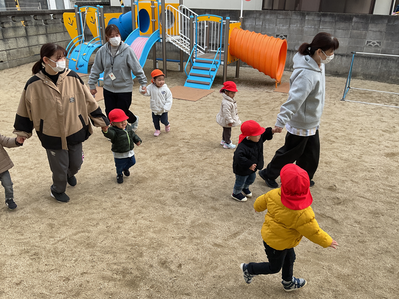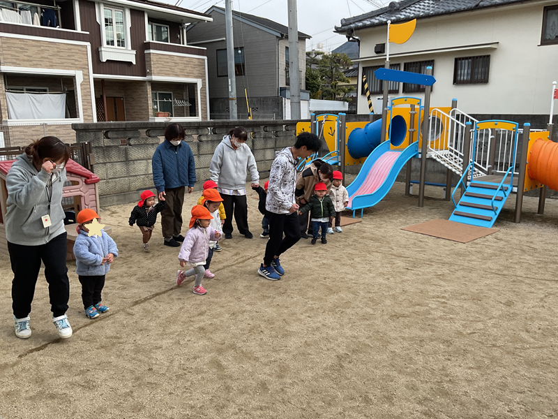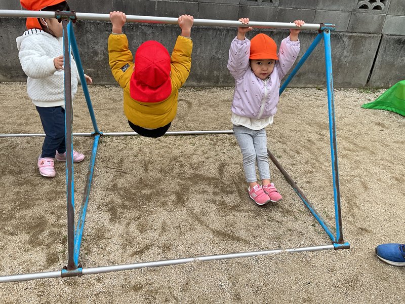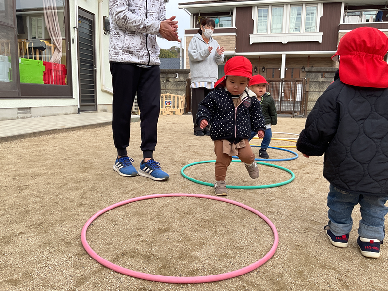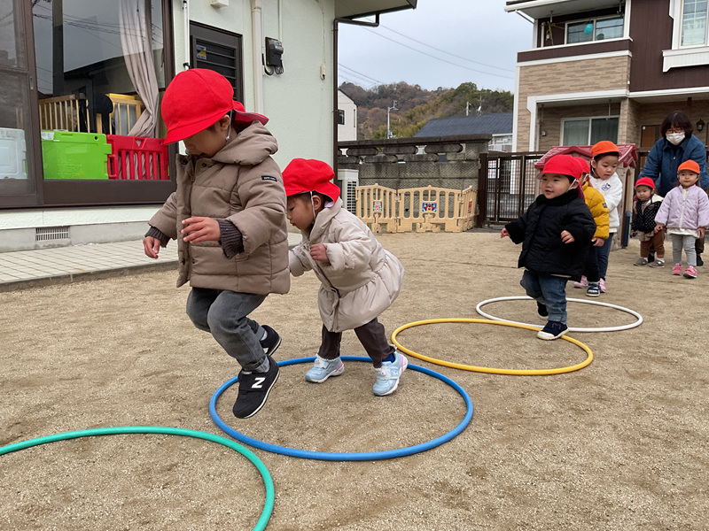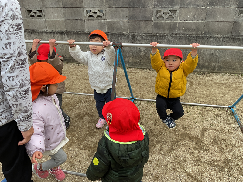 溝辺園日記2026.01.15 体操教室✨ 戸外で体操教室がありました♪ かけっこしてウォーミングアップをした後は✨ フラフープをジャンプや歩いてまたいだり♪ 鉄棒にぶら下がったりとたくさん身体を動かしました♪ たのしかったね☺