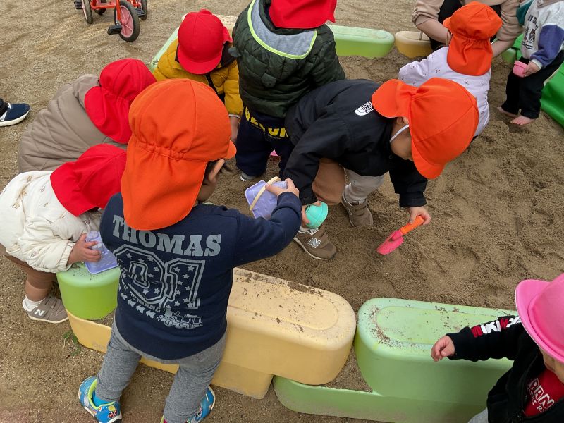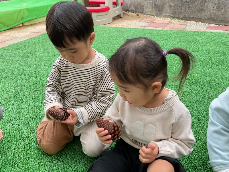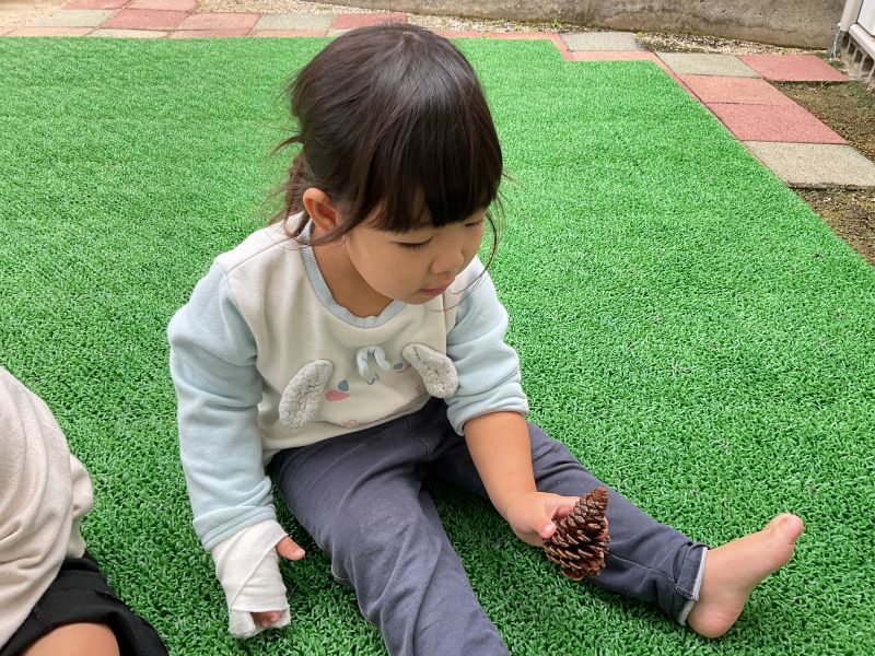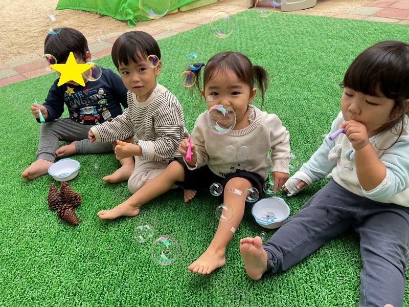溝辺園日記2025.12.17 元気いっぱい!! 今日も元気いっぱいなもみじ組さん🎵 園庭でのびのびと体を動かしています😄 その後松ぼっくりを発見👀 ”まつぼっくりがあったとさ~🎵”と歌を歌いながら感触に触れました🎵 その後はみんなが大好きなシャボン玉を吹いて楽しみました!