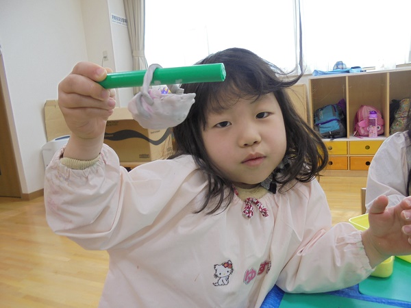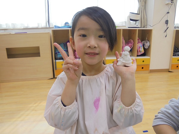 小坂園日記2018.02.27 大好き!粘土遊び! 勝山園 大好きな粘土遊びをしました(*^-^*) 「粘土やったー!」と大喜びで準備し、いろいろなものを作っていました。 これは “ウィンナー” とってもうれしそうな顔です(*´▽`*) これは “豆が入っているかご” ぜんぜん落ちません!すごい!(/・ω・)/ これは “ドレスを着た女の子” です。 細かいところまで上手に作っています!👗 粘土遊びをする度にどんどん上達している子供達! 次は何を作って見せてくれるかとても楽しみです(*^-^*)