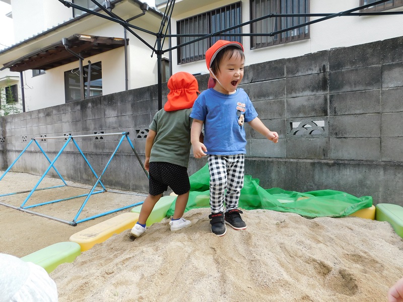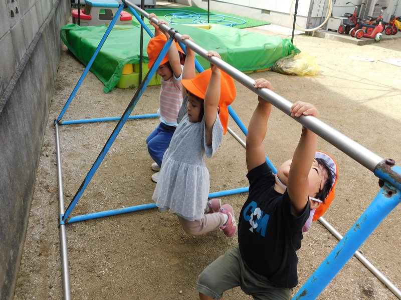 溝辺園日記2022.10.03 戸外遊び♪ 運動会の練習をした後は、園庭で遊びました😊 お家の中が落ち着く様子です🍀 砂場の山に登ってうれしそうな子どもたち🎵 もみじ組さんは鉄棒にぶらさがれるよ✨ 誰がながくできるかな😆❔