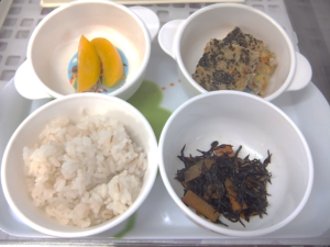 今日の給食2017.01.05 溝辺園・今日の給食 今日の給食は、 ごはん 松風焼き ひじきの炒め煮 もも でした°˖✧◝(⁰▿⁰)◜✧˖° 松風焼きは、お正月🎍の行事食(おせち料理)の一つです。 おせち料理🍱では末広形に切り、縁起物とされます。 日本の文化に触れ、日本の行事食を楽しみたいですね🎶