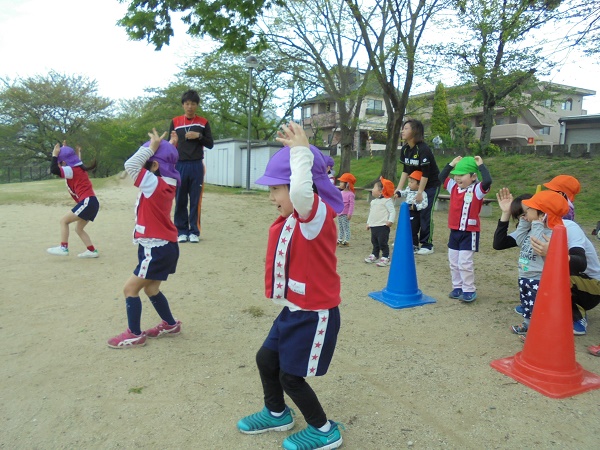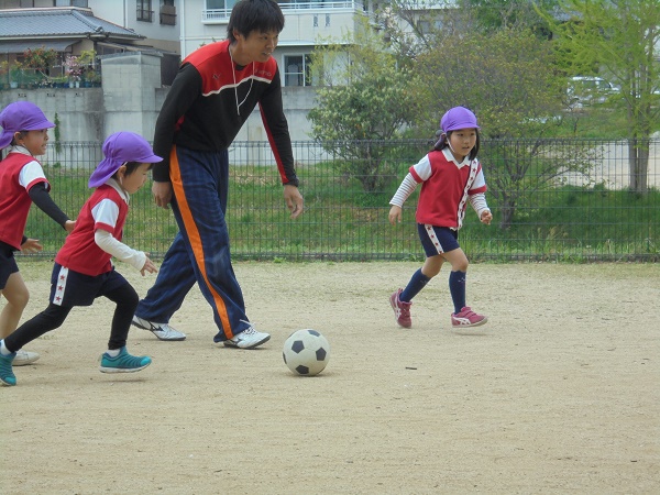 最後は先生対子どもたちでサッカー⚽をしました。先生のドリブルを遮ることも