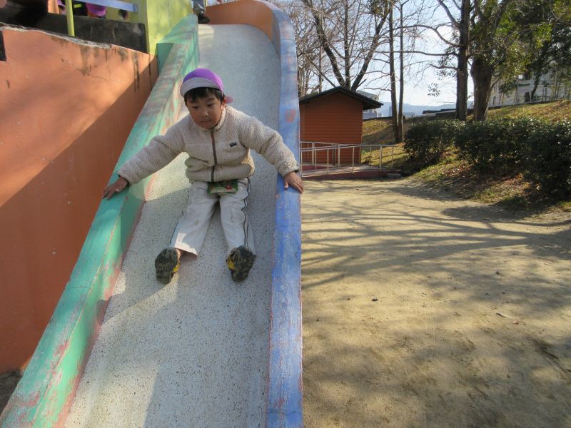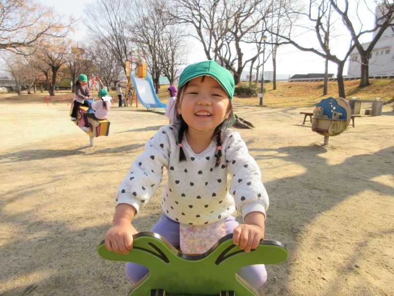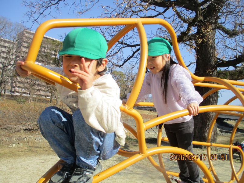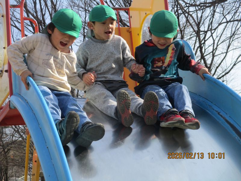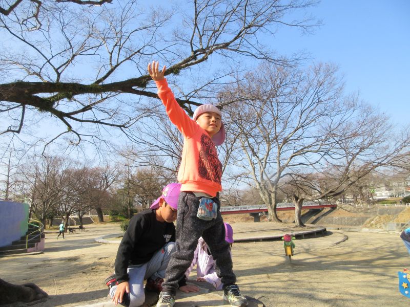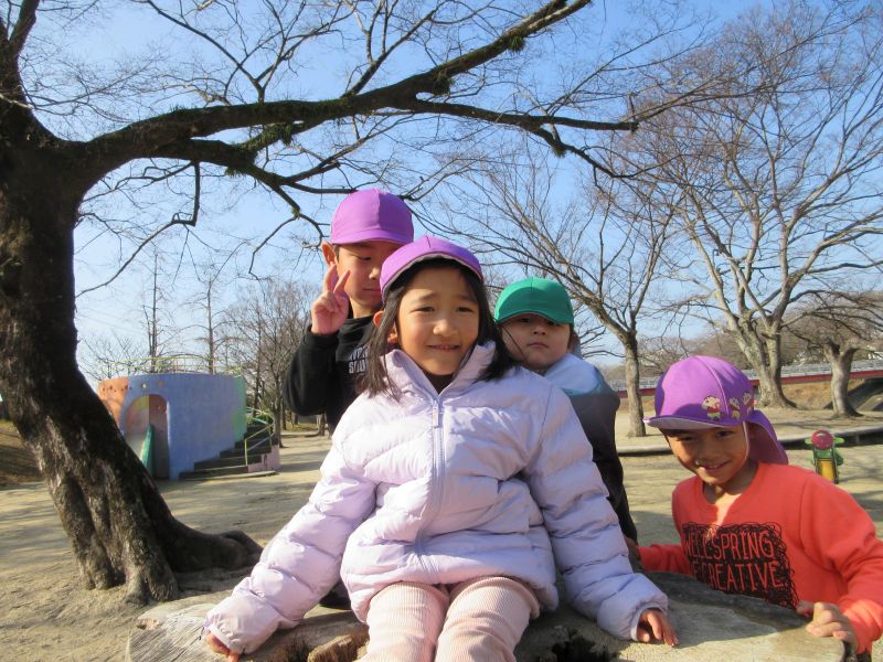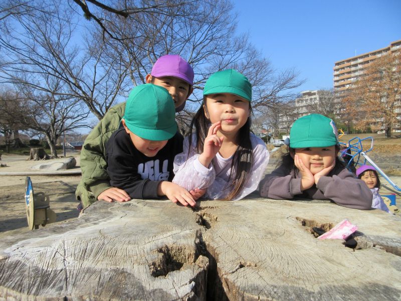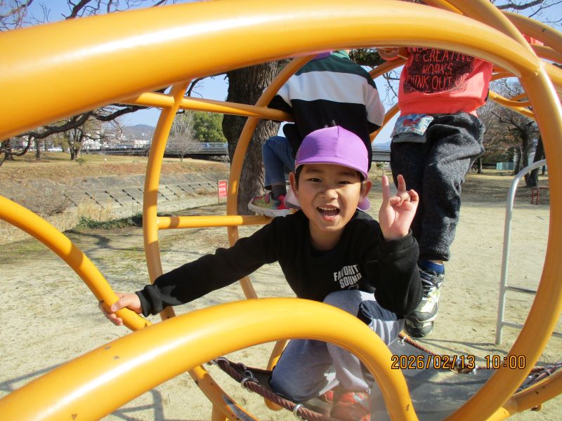 小坂園日記2026.02.13 石手川公園で遊んだよ! ふじ組・けやき組のみんなで石手川公園へ遊びに行きました🌞 「みてみてー!」 恐竜の遊具に、シーソーもありました! すべり台も大きいから、みんなで滑れたよ😆 大きな切り株を発見! ヒーローのポーズ✊ みんなでお出かけ、楽しかったね♬