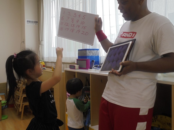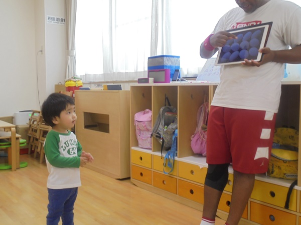 小坂園日記2018.05.17 英語教室♪ 勝山園 大好きな英語教室でした♪ まず始めに20までの数を覚えました。 さあ玉子は何個あるのかな? 小さい組さんもじーっと耳を澄まして先生の発音を聞いています(*^-^*) さあ次は恒例のボール拾い!みんな夢中で追いかけて 今日もいっぱい取れました(≧▽≦) 最後は、アルファベット。 発音がとても上手な子どもたちです!(^_-)-☆ あっ、先生の後ろには小さい組さんが! アルファベットよりもケビン先生が大好きなんです(*´▽`*)