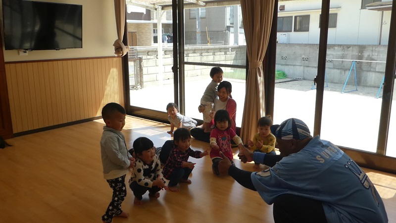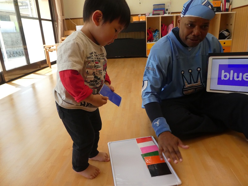 溝辺園日記2018.05.25 英語教室♪ 溝辺園 ケビン先生が来ると とっても喜ぶ子どもたち☆ミ 英語教室はどんなことをするのかな😊 まずは歌に合わせて 体を動かそう🎵 ひざをトントンしたり 小さくなって “グッ👍” 他にもたくさんのポーズをしました✨ そのあとは色のカードやボールも使って楽しみました!(^^)! たくさんの英語にふれることが できました(#^^#)