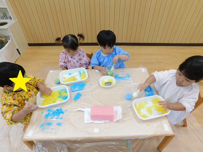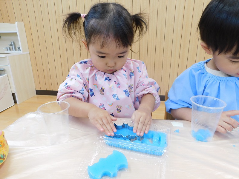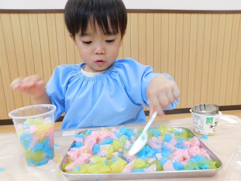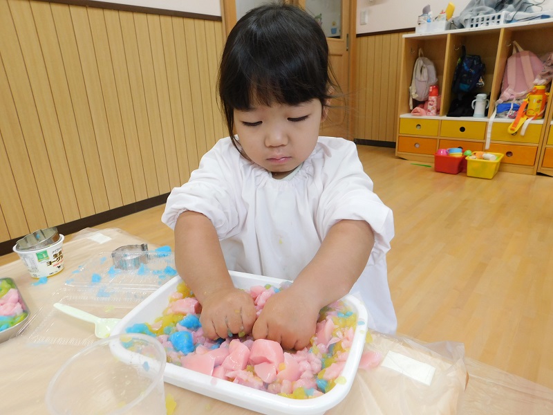 溝辺園日記2025.11.21 誕生日会🎵 今日のハッピーデーは寒天遊びをしました!♪ 最初は「これはなんだろう?」と不思議な表情を浮かべていましたが、少し触って感触を確かめると夢中になって遊び始めたもみじぐみさん🎵 寒天の形が変わっていく様子を肌で感じながら「じゅーすどうぞ!」「これはチョコレートよ!」と大好きな食べ物に見立てながら楽しみました😊