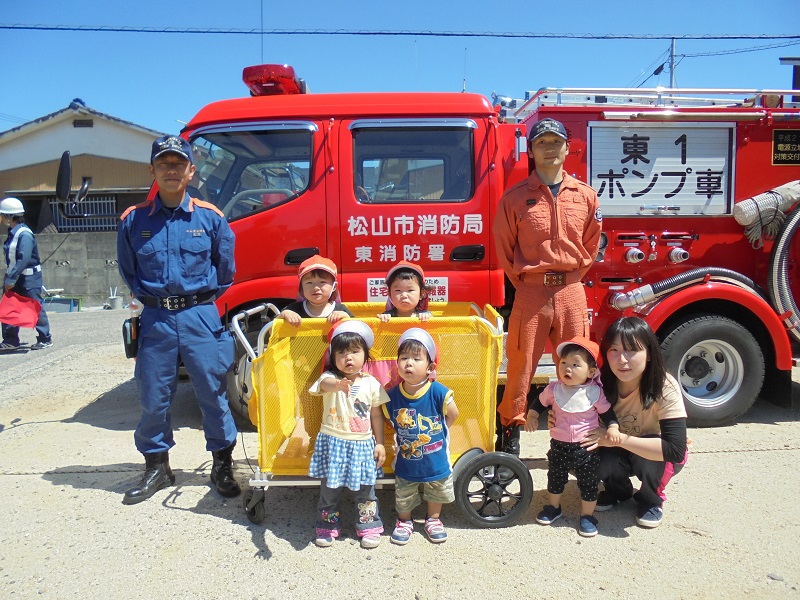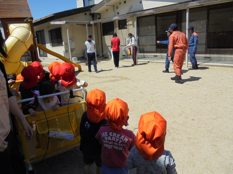 溝辺園日記2018.05.23 避難訓練🚒溝辺園 消防士さん🚒立ち合いのもと 避難訓練を行いました! 緊張気味の子どもたちでしたが とっても上手に訓練できましたよ♪ 消火訓練にも興味深々です✨✨ ポンプ車も近くで見せてもらい 大興奮の子どもたち( *´艸`) 最後はクラスごとに写真をとりました💛 避難訓練、よく頑張りました✌!