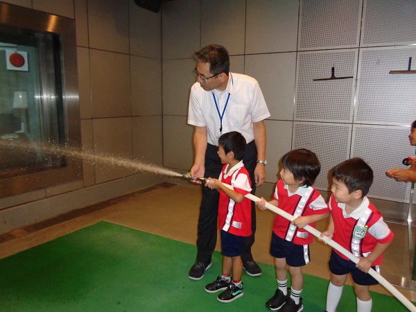 画面の火災に向かって放水!さすが男の子、なかなか上手です!