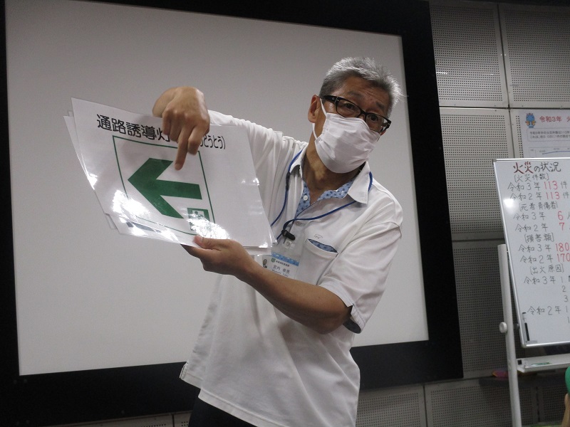 火事の時は、姿勢を低くして通路誘導灯に従って進むと出口に出ることができると教わりました。