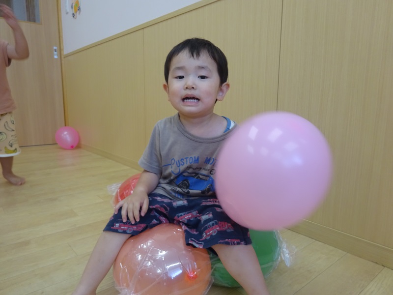 小坂園日記2022.06.30 風船🎈 もみじ組は風船が大好き💗 風船を見つけると「ふうせんする~!」と言っていつも駆け寄ってきます✨ みんなの大好きな風船をマットにしてみました! 圧縮袋の中の風船はみんなが乗っても不思議なことに全く割れません😊 割れない風船にみんな大喜びでした! もちろんマットになってない風船でも遊びました⭐