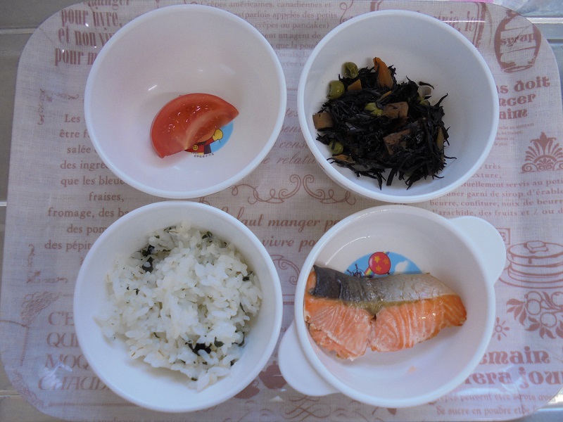 わかめご飯 鮭の塩焼き ひじき煮 トマト です